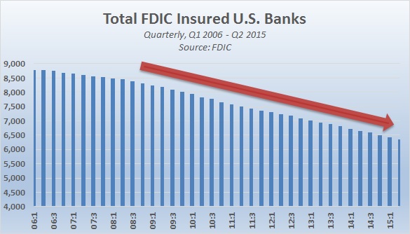 Some of this consolidation has been driven by bank failures -- primarily, the Savings and Loan Crisis of the late '80s and early '90s, and followed by the financial crisis in the late 2000s. Some of the consolidation has also been driven by mergers and acquisitions; banks today are considerably larger than they were in prior generations.