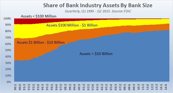 Between all the M&A and bank failures, the largest U.S. banks have ended up with a huge share of industry assets.
