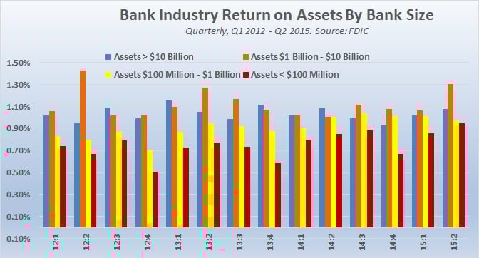 The largest banks are reporting decent returns on assets, but their performance is in no way outshining the numbers being reported by mid-sized competitors. The smallest banks, however, do clearly lag the rest of the industry.