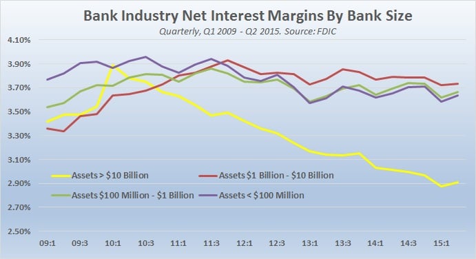 Most analysts expect the Fed to begin raising interest rates later this year, or early in 2016. Rising rates will, in most cases, boost net interest income, and net interest margins. While this should benefit banks across the industry, it's unclear if banks with more than $10 billion in assets will be able to fully make up the margins lost during the past six years.