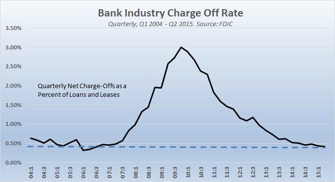 Net charge offs, as of the 2015 second quarter, were at their lowest level since 2006. On the one hand that's a strong performance, but on the other it's also a bit unsettling to know that it's taken almost a decade to return to these pre-crisis levels. For an investment today, we should consider where we are in the credit cycle currently, but more importantly, where we might be in the next few years.
