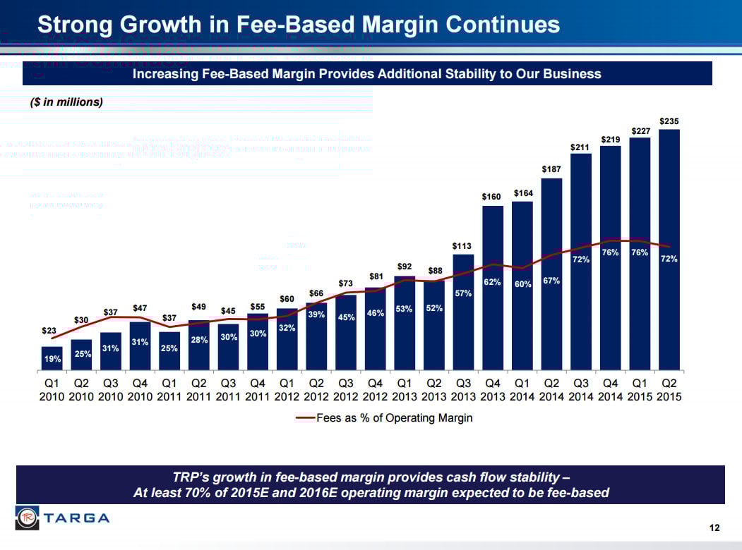 While the company had been making solid progress adding more fee-based assets to its portfolio, the percentage slipped earlier this year. However, that's solely due to the acquisition of Atlas Pipeline Partners, which had a smaller percentage of its margin supported by fee-based assets. While Targa is building additional fee-based assets, it doesn't expect its percentage to be much higher than 70% through the end of next year. While not a red flag, it is something investors should keep an eye on.