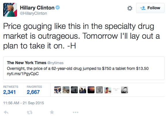 Democratic candidates certainly have been upset with the rising cost of drugs recently, as Presidential candidate Bernie Sanders has also put big pharma on notice. The Senator has been active in sending out official letters directly to pharmaceutical companies that have been jacking up the prices they charge, and has been requesting information to justify the price hikes. So far letters have been sent out to Turing Pharmaceuticals and Valeant Pharmaceuticals, as each of those companies has raised prices on certain medications significantly. Sanders noted: