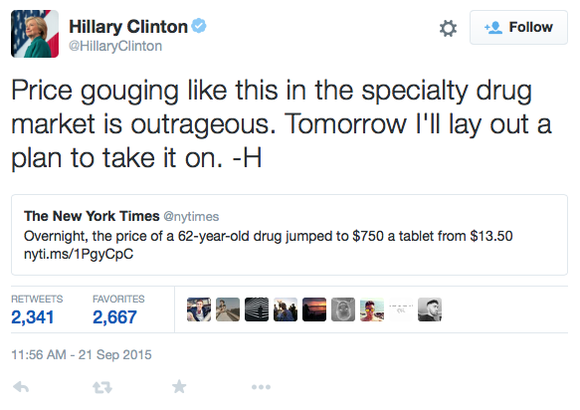 While it's usually tough to find a single culprit that causes an entire sector to sell off, one clear catalyst appears to be presidential-hopeful Hillary Clinton. Early in the week she tweeted out an article by The New York Times to her followers that referenced a huge price jump in a decades-old specialty drug. She called the move "price gouging" by the manufacturer, and she then promised to lay out her plans to address the ever rising cost of drugs.