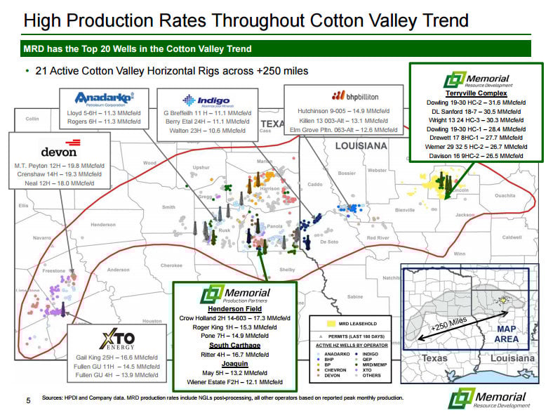 Memorial Resource Development is one of a handful of companies focused on developing what's known as the Cotton Valley Trend, which runs through East Texas and North Louisiana. As the map on the slide below shows, it has a concentrated position in Lincoln Parish, Louisiana.