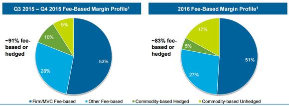 The MLP's direct margin exposure to commodity prices is only 19%, and 22% for 2015 and 2016, respectively. However, a good deal of Enable's "other fee-based" contracts -- especially in its gathering and processing segment -- are indirectly exposed to energy prices because they're volume dependent.