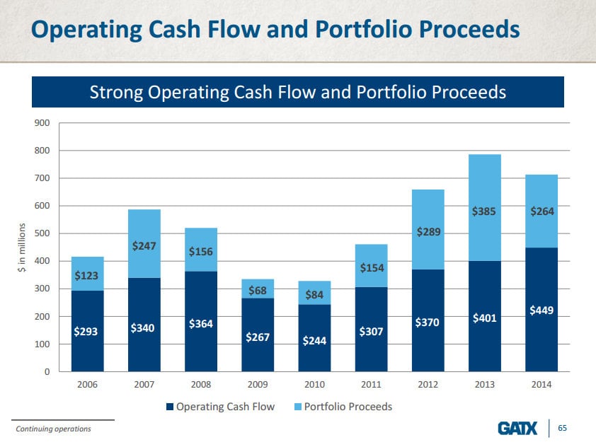 While GATX's core business is leasing railcars, the company is also very active in managing its portfolio. As such, it routinely divests older assets and often generates substantial accounting profits from these sales. As this next slide notes, this combination of recurring operating cash flow from leases as well as proceeds from portfolio divestments produces a lot of cash for the company each year.