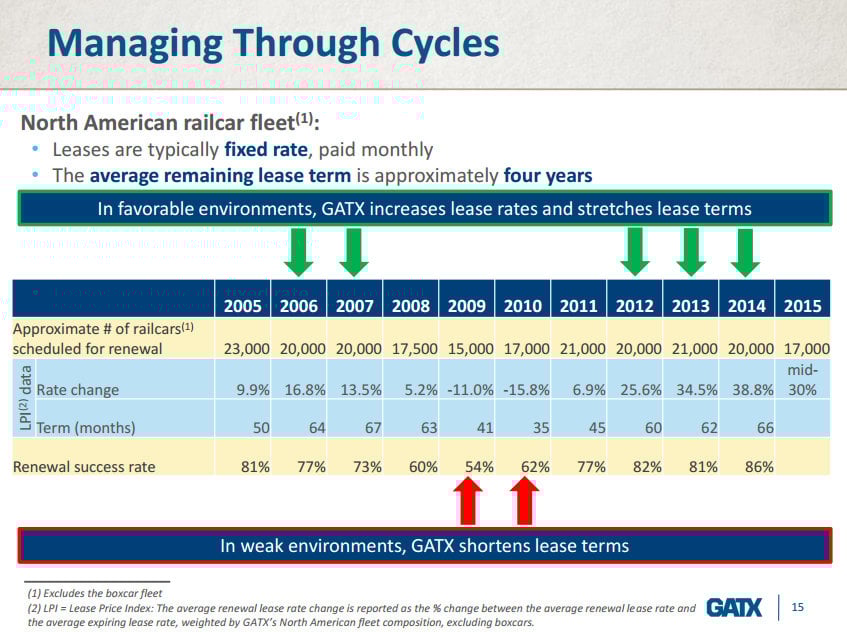 That being said, the company's business isn't completely immune to a global economic slowdown. As this next slide notes, when the economy slows it impacts GATX's ability to renew leases and increase lease rates.