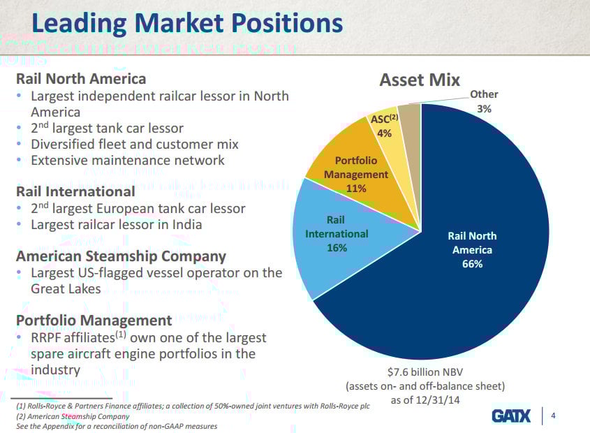 GATX's core business is railcar leasing in North America where it is the largest independent railcar lessor. As the slide below notes, that segment contains approximately two-thirds of the company's assets.