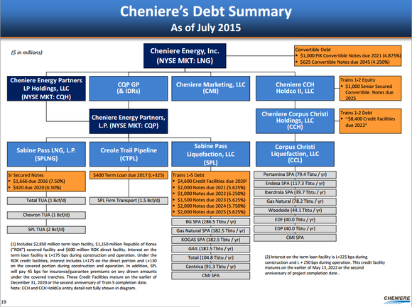 That's why I'm leaning toward Chanos' position, as Cheniere Energy just worries me. It has taken on an incredible mountain of debt via a very complex structure. Just one look at the following slide sends shivers up my spine.