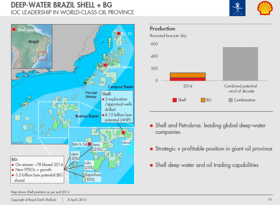 The argument for the deal, though, is that the two companies overlap significantly where it counts to the two companies, most notably in deepwater Brazil and LNG. Both Shell and BG Group were some of the biggest bidders to work with Petrobras (PBR +0.25%) in the pre-salt deepwater basins, and the combined position of these two companies in this region could almost triple to 600,000 barrels per day by the end of the decade if development plans stay on track.