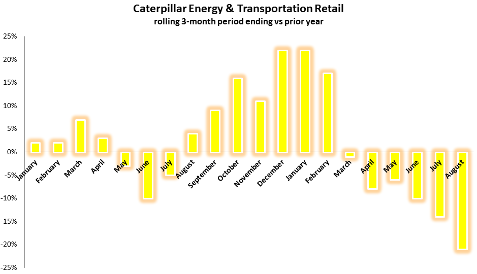 Those aren't the only two business segments struggling to generate sales for Caterpillar's products. Caterpillar's construction industries' retail sales have continued to check in with steep declines.