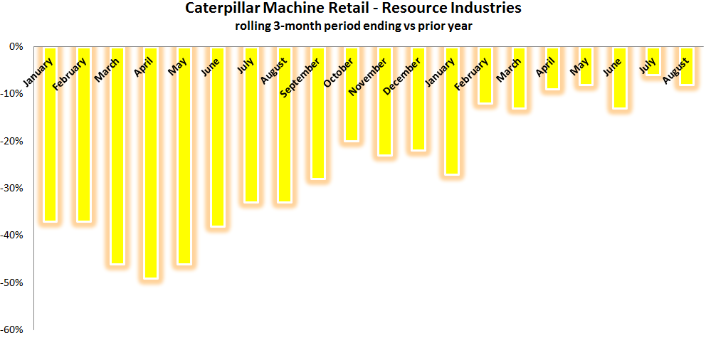 Meanwhile, Caterpillar's resource industries' sales have continually improved, but remain in negative territory.