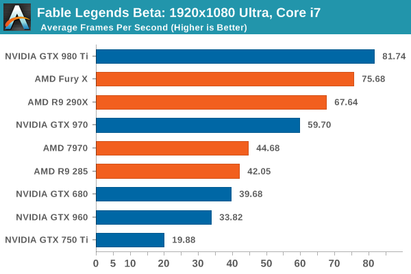 A second DirectX 12 benchmark was released in September, this time using Fable Legends, an upcoming game built on the popular Unreal Engine 4. Anandtech ran the benchmark, and the results are more in line with what one would expect. In this case, NVIDIA's GTX 980 Ti easily wins out, beating AMD's high-end Fury X as well as the 290X. According to Anandtech, the benchmark does use async compute, although it may not be used as heavily compared to the Ashes benchmark.
