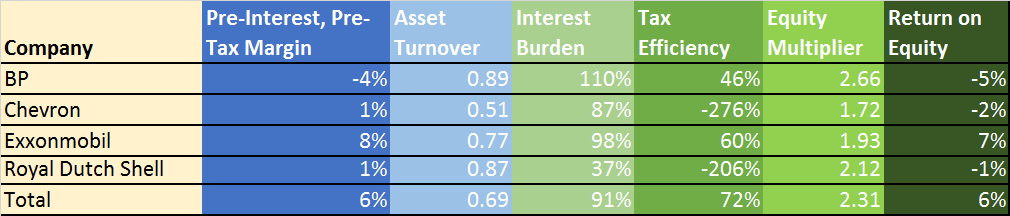 By multiplying all of these components together, you get return on equity. Here is how each of these companies compare using this model: