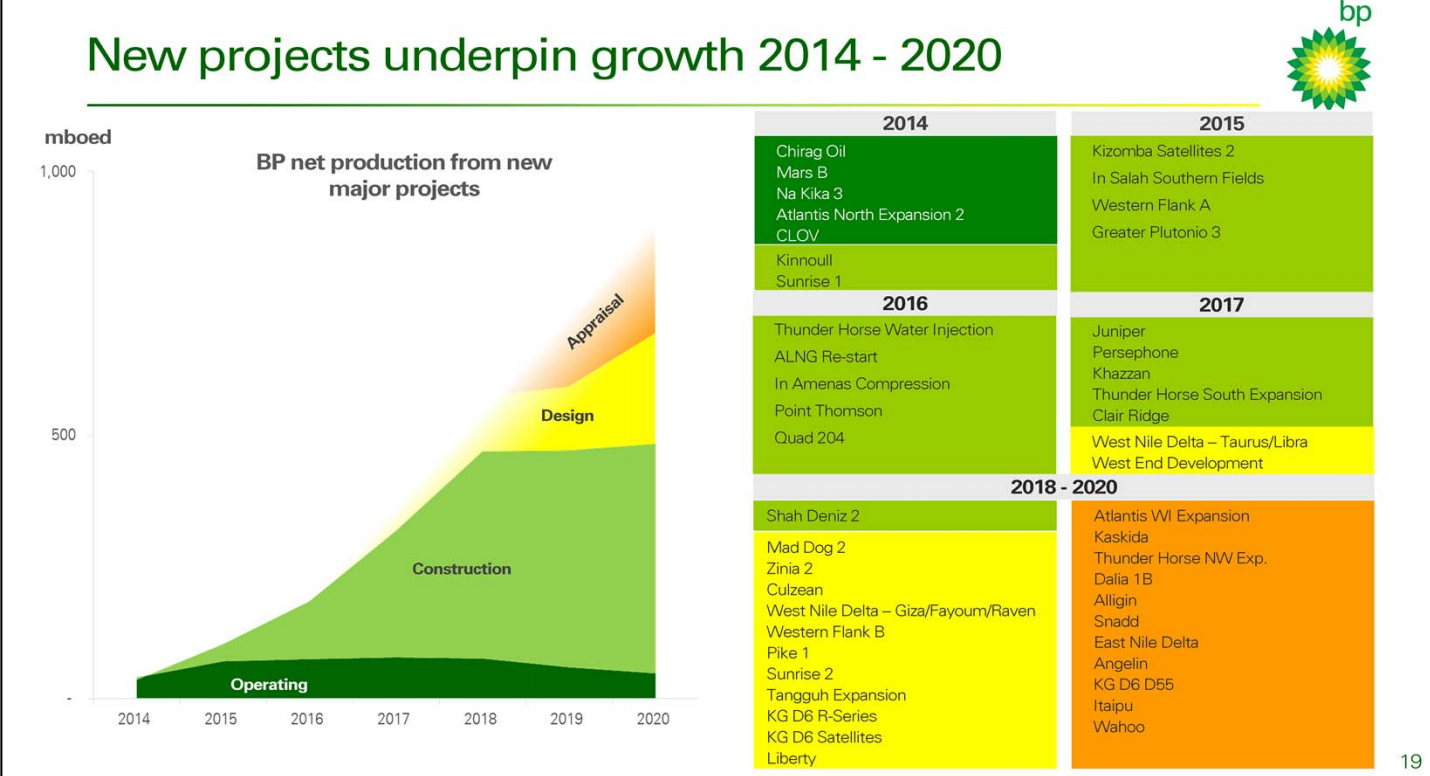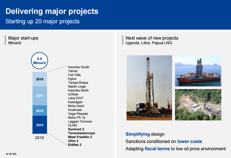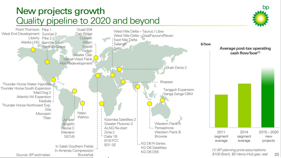 The one note of caution to these growth plans is that many of these developments were given the green light under an assumption of $80-per-barrel oil price, and its projects in the pipeline for beyond 2020 are currently screened using $100-per-barrel Brent price.