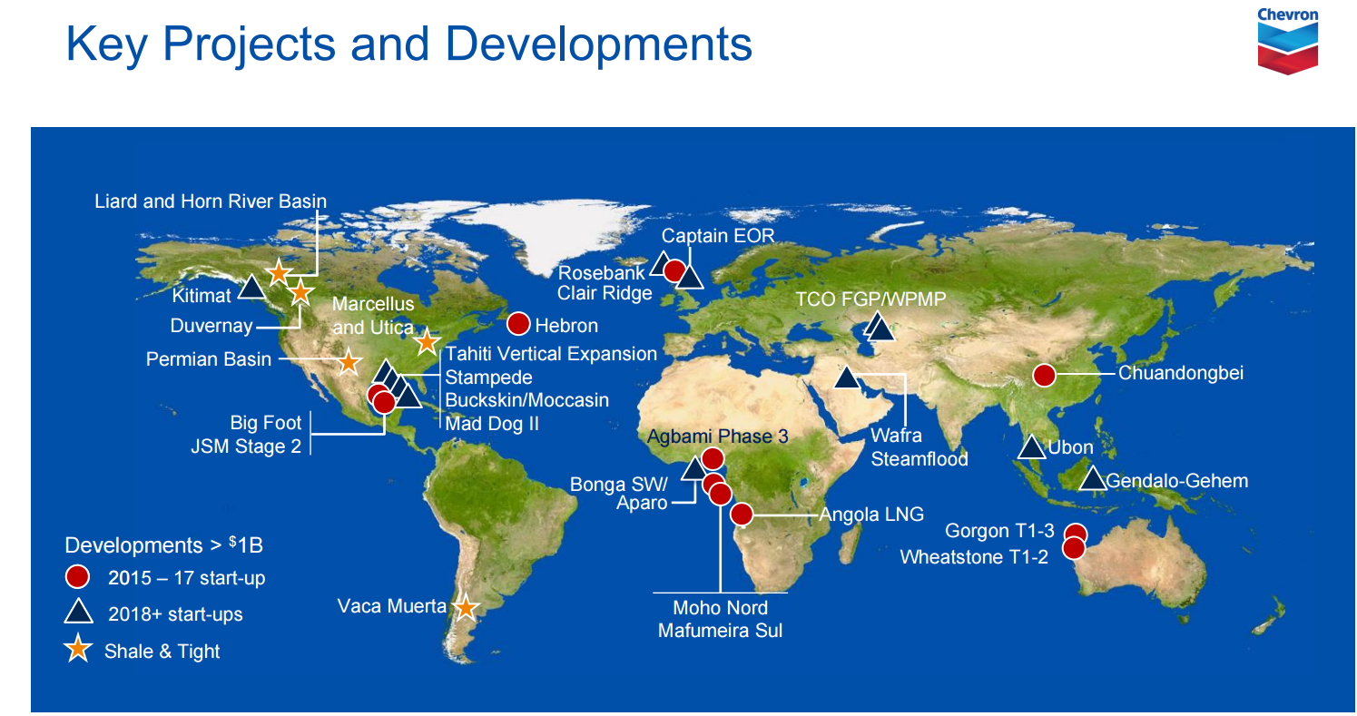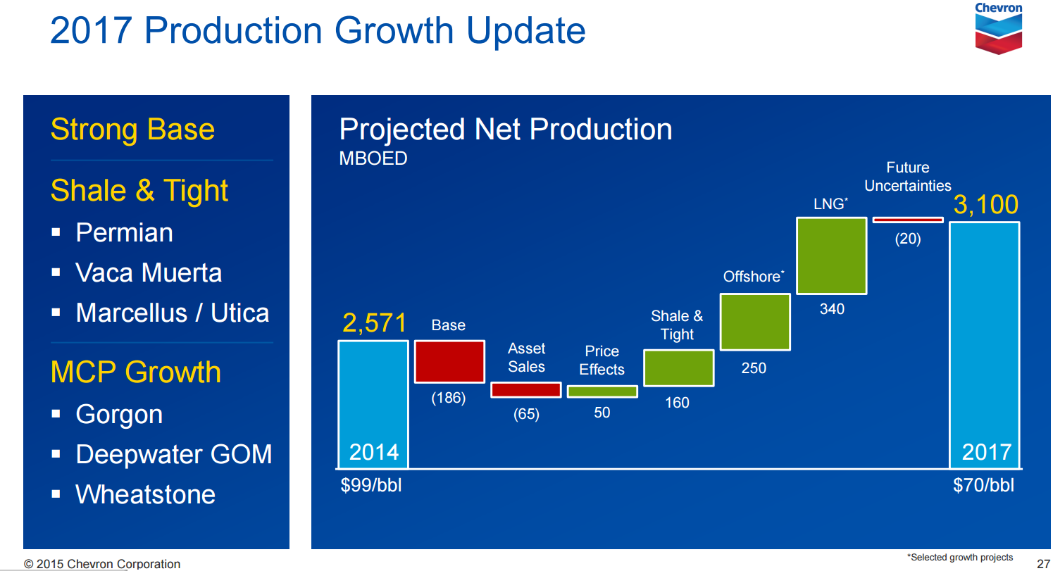 Because of several various factors such as the company's struggles to remain within cash flow and lower oil prices, Chevron's projected production of 3.1 million barrels per day is a slight decline from what is was projecting a couple of years ago. Still, an addition of more than 500,000 barrels per day in a three-year span is pretty ambitious.