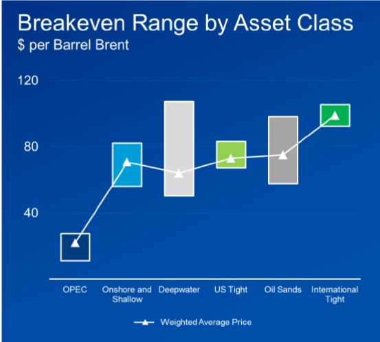 One of the great challenges for the Big Oil players over the next couple of years will be the ability to control costs for the development of new resources. Much of their new production sources come from more expensive sources of oil like ultra-deepwater fields and oil sands, two oil sources with high breakeven cost ranges.