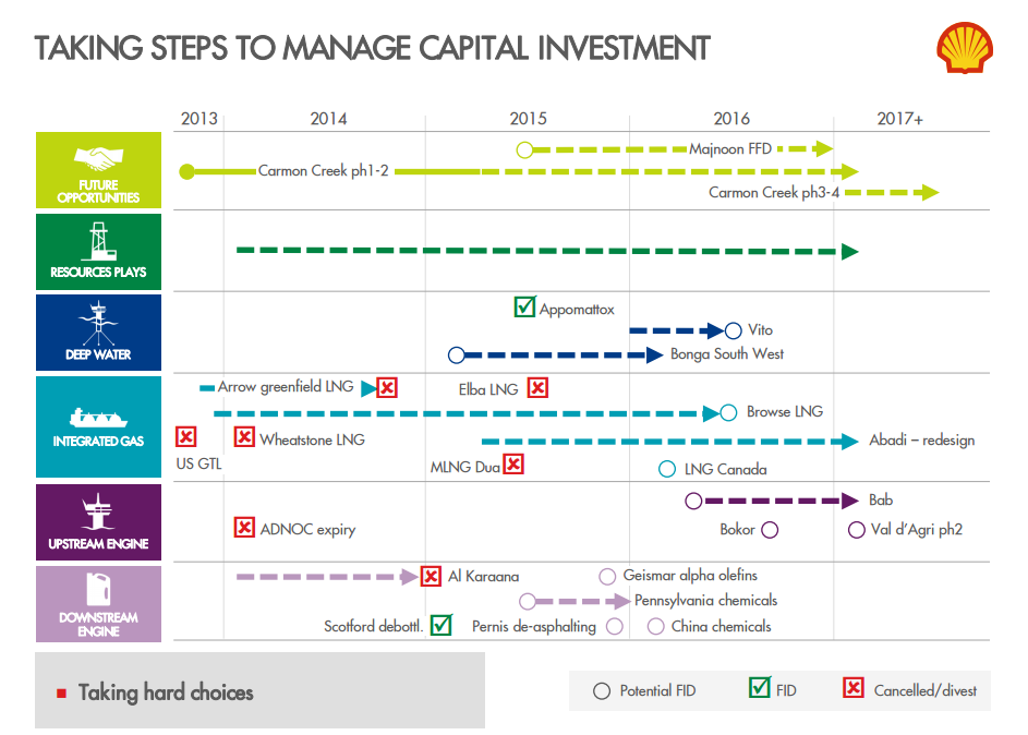 Like BP a few years ago, Shell has decided to forgo making future growth projections based on production. Instead, the company does its projections on how they will generate free cash flow for the company. Over the next five years or so, it has a suite of about 10 major projects that constitute its biggest capital obligations, which mostly related to either LNG or deepwater production.