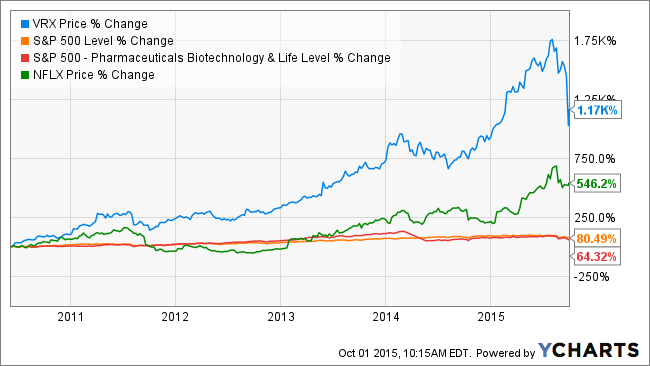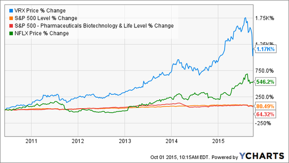 Even after the recent rout, shareholders have had a remarkable run under the leadership of J. Michael Pearson, a former McKinsey consultant. The following chart shows that Valeant's stock price performance has demolished that of the broad market and its industry (red and orange lines), and even left Netflix in its dust (which isn't comparable in any way, except as a growth company and the best-performing stock in the S&P 500 last year):