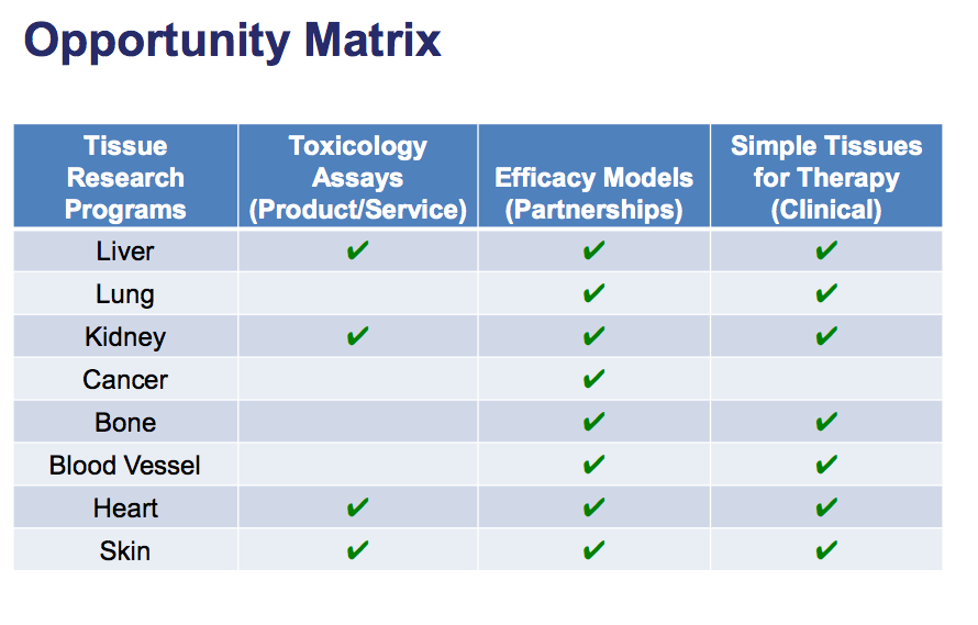 Perhaps the most interesting development from Organovo came to light when the company held a round of funding through stock offerings this year. Instead of just focusing on developing tissues that Big Pharma companies could use in the drug discovery process, Murphy said that his company would be taking a multi-pronged approach to revenue generation moving forward. This includes: