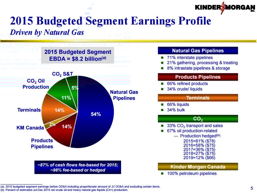 As the slide below notes, Kinder Morgan clearly fits the bill here as 96% of its cash flow this year is either fee-based or hedged.