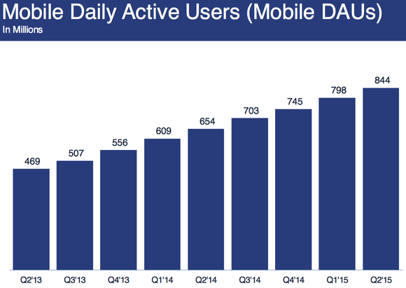 The social network's mobile DAUs, or the users who use Facebook at least once every day on a mobile device, were 844 million in Q2, up 29% from the year-ago quarter. Expect somewhere around 865 million in Q3.