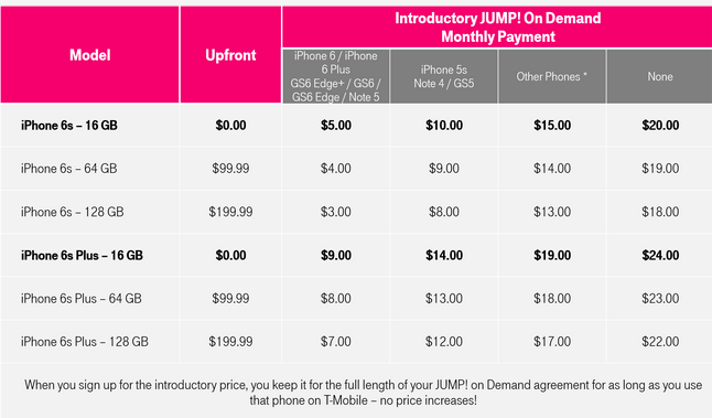 Now, for a limited time, it's offering consumers the same lease on an iPhone 6s with Jump! On Demand for as low as $5 a month, as long as they have a device that they own outright to trade in. The higher-end the trade-in, the less the customer will pay.