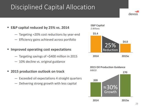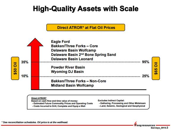 As that slide notes, at a $50 oil price the company can earn a pretty solid 35% direct after tax rate of return across a lot of its drilling portfolio. However, those returns skyrocket to 95% if those wells are brought online once oil prices hit $65 a barrel. That's a game-changing difference and is largely driving EOG Resources' decision not to grow production in the current environment. This suggests companies like Devon Energy are not only leaving a lot of money on the table by accelerating production growth, but they are part of the problem as they are accelerating oil supplies into an already over-supplied oil market, thus delaying a recovery in the oil price.