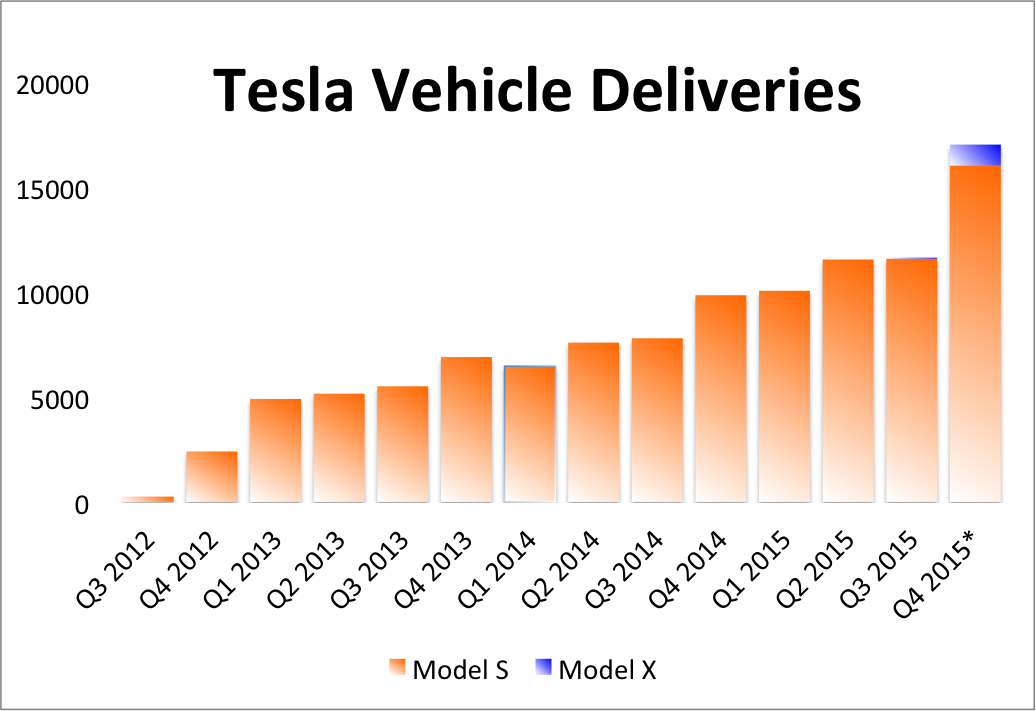 Tesla vehicle sales by model. Data source: Quarterly SEC filings and quarterly sales releases. Quarter marked by asterisk indicates deliveries needed for Tesla to achieve the low end of its target guidance range of 50,000 to 55,000 vehicles. Breakdown of Model X units shipped versus Model S units shipped is an author estimate.