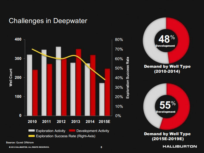 What you see on the slide ... the light bars represent exploration wells, which we can see over time declining ... the red bars are development wells, and so there, we see them declining, but on a relative basis, increasing. And then the yellow line, for deepwater depicts exploration success or the lack thereof. If you take a peek at the circles on the right, what that demonstrates is the change and the quantity or the relative quantity of exploration versus development. And so while activity is declining, there is no question that things are being pushed to the right.