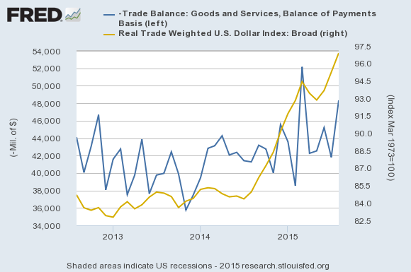 The following graph shows the U.S. trade deficit for the three-year period through August (blue line) against the real-trade weighted U.S. dollar index (an index of the value of the dollar against other world currencies, yellow line).