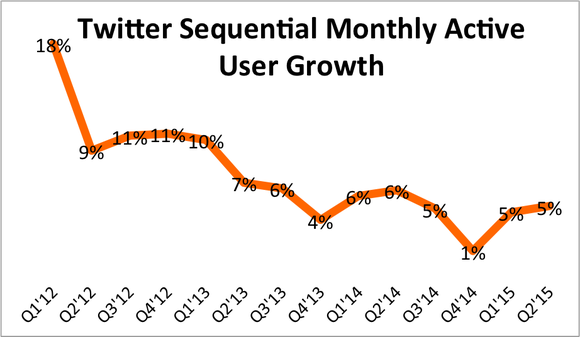 Twitter's user growth has slowed recently. And the chart above doesn't fully capture the severity of Twitter's slowing user growth problem, since Q2 includes the company's SMS Fast Followers, which are very low value to the business. Excluding fast followers, Twitter's user base grew just 0.07% sequentially. Data for chart retrieved from respective quarterly SEC filings. Chart source: Author.
