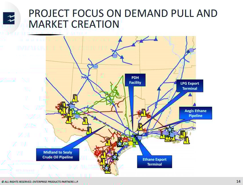 As that slide notes, the company has a number of key pipeline projects that are driven by the pull of demand for oil and natural gas liquids into the key refining and petrochemical hubs of the Gulf of Mexico. Further, the company has two export projects that will send cheap NGLs like propane and ethane to global markets. Finally, the company is building a PDH facility, which consumes cheap propane and turns it into higher valued petrochemical feedstocks. As such, Enterprise is primed to take advantage of the increased demand for cheap energy suggesting that the company's growth won't slow like it will for others as it is focused on building projects that are driven by demand growth as opposed to supply growth, which will likely be more muted as prices remain weak.