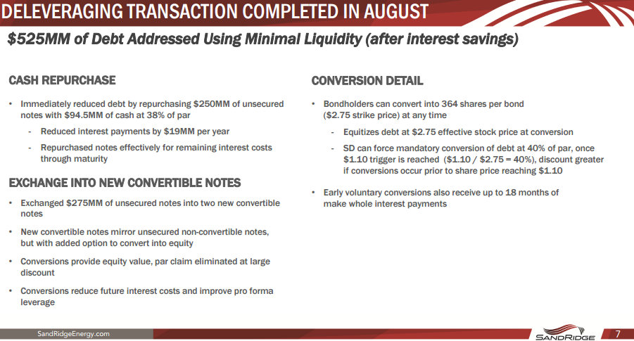 Under the terms of this latest exchange, SandRidge Energy is repurchasing $100 million of its senior notes for just $30 million in cash. In other words, it's a $70 million net reduction in the company's debt and helps to partially offset the increase in net debt from the company's recent Pinon acquisition. In addition to that, the company is exchanging $300 million of its senior notes for convertible notes.