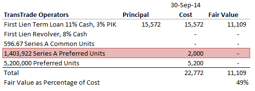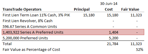 Let's move to the next quarter, which ended June 2014. Fifth Street reported that it owned a new security in TransTrade's capital structure, showing that it invested $1.4 million into Series A preferred units, which were immediately written down to zero within the quarter. Notice that the Series A preferred units did not exist in the prior quarter.