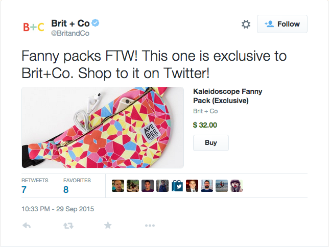 But Twitter is giving retailers more ways to use the buy button beyond simply embedding it in a tweet. Earlier this year, the company introduced product pages. These pages not only feature information about the product and the ability to buy it directly on Twitter, but they collect tweets about the product as well. This allows brands to easily monitor social activity around specific products, which may help determine which ones are worth promoting.