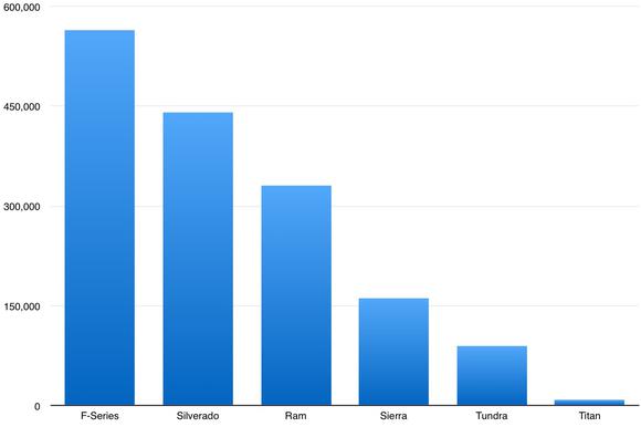 Really, it's not close. The F-Series leads GM's Chevrolet Silverado line by 123,547 sales with just three months to go. The Silverado would have to out-sell F-Series by over 40,000 a month for the rest of the year just to catch up. Given that GM sold 43,725 Silverados to 69,651 F-Series last month, that's obviously not happening.