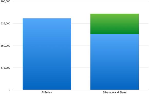 But GM sells two lines of full-size pickups -- the Silverado and its upscale siblings, the GMC Sierra family. If we add them together, the story is a little different.