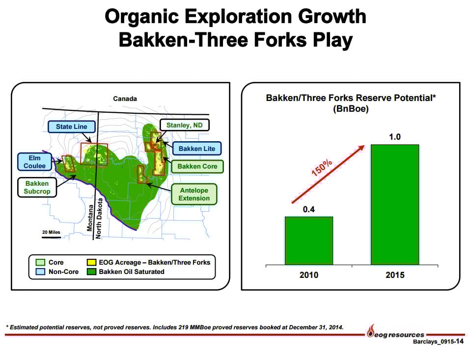 As the slide below shows, EOG Resources has increased its estimate for oil and gas reserve potential from its acreage in the Bakken-Three Forks play from 400 million BOE to 1 billion BOE over the past five years.