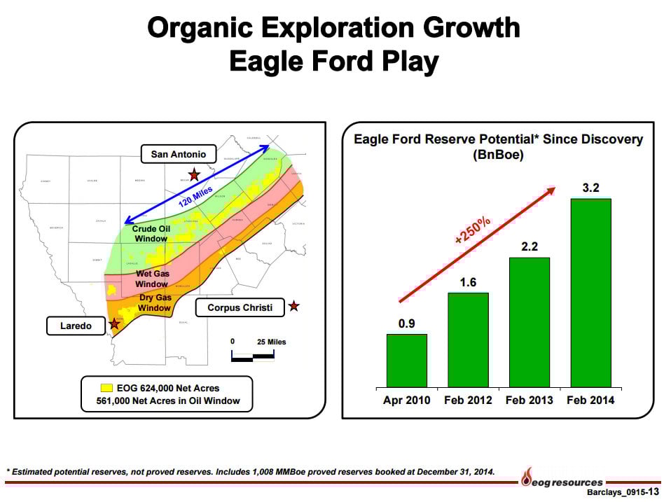 This focus on organically exploring within its current acreage position has paid off in other plays as well. As this next slide shows, the company has increased its reserve potential in the Eagle Ford by 250% since 2010.