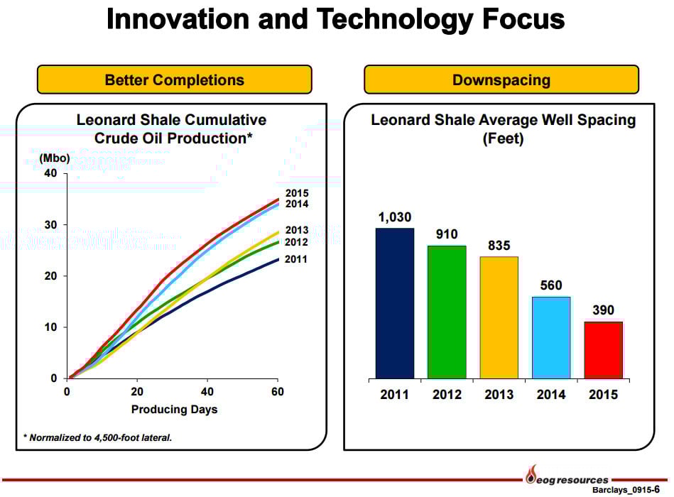 This is yielding two results. First, the improved completion designs enable horizontal wells to not only hit the best spots within the reservoir so that it can access more of the oil and gas, but it also improves the flows right along the horizontal well bore. Meanwhile, by downspacing wells closer together the company isn't leaving as many untapped pockets of oil in the reservoir.