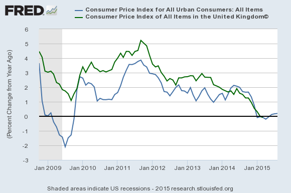 As the following graph demonstrates, the U.S. and U.K. inflation rates have been tightly correlated since Lehman's failure (the blue line is a plot of the year-on-year inflation rate in the U.S.):