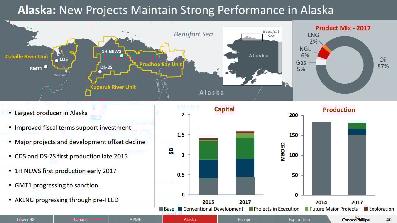 ConocoPhillips is currently one of the largest oil producers in Alaska, which is an important part of the company's global portfolio as 11% of its total production comes from the state. However, it's not a growth asset for the company -- far from it, actually, as ConocoPhillips has only recently increased its spending in Alaska just enough so it can offset production declines from its legacy fields.