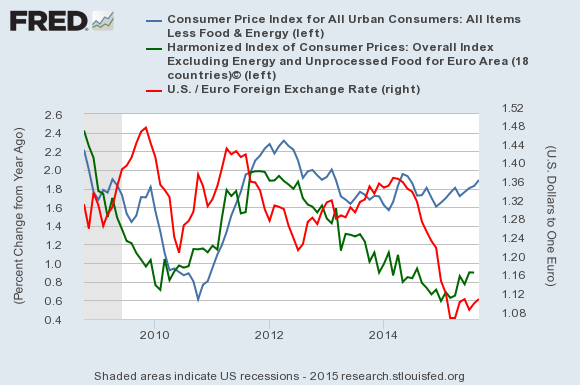 If we look at the same graph overlaid with the EUR-USD rate (red line), the euro has lost 15% relative to the dollar over the entire period: