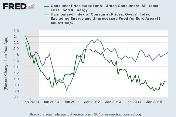 Here's how core inflation has evolved in the U.S. and euro area on a year-to-year basis since October 2008 (the month after Lehman Brothers' bankruptcy filing):