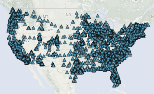 Source: Energy.gov; triangles represent non-private electric-vehicle charging stations.