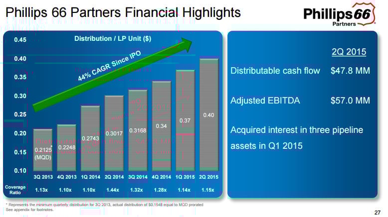 Further, because of its close relation with parent Phillips 66, it has the opportunity to participate in the growth Phillips 66 is creating within its own midstream business. That's because Phillips 66 is building a number of midstream assets that it plans to drop down to Phillips 66 Partners over the next few years, with the companies recently completing a $1.1 drop-down transaction. Looking ahead, Phillips 66 plans to drop down upwards of $10 billion in assets to Phillips 66 Partners by 2018.