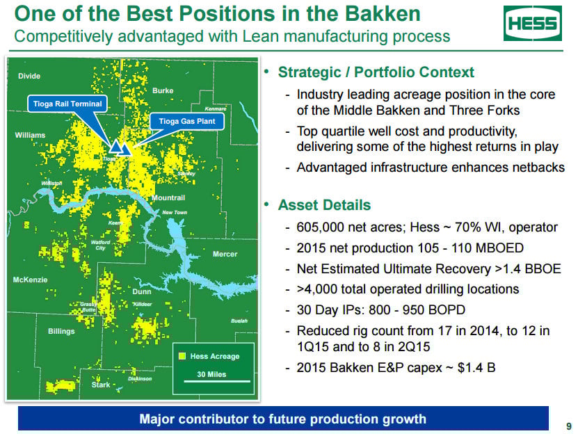 Some will suggest the Occidental Petroleum sale is a bad omen for M&A in the oil market since its assets fetched one-sixth of the initial estimated value. However, the fact of the matter is, the timing of the sale wasn't ideal because the sale process kicked off when oil was just starting its decent. Further, Occidental's assets aren't in the core of the play, which is a huge competitive disadvantage. Location really matters; it is why Hess is fueling strong growth from the Bakken, and Occidental could not.