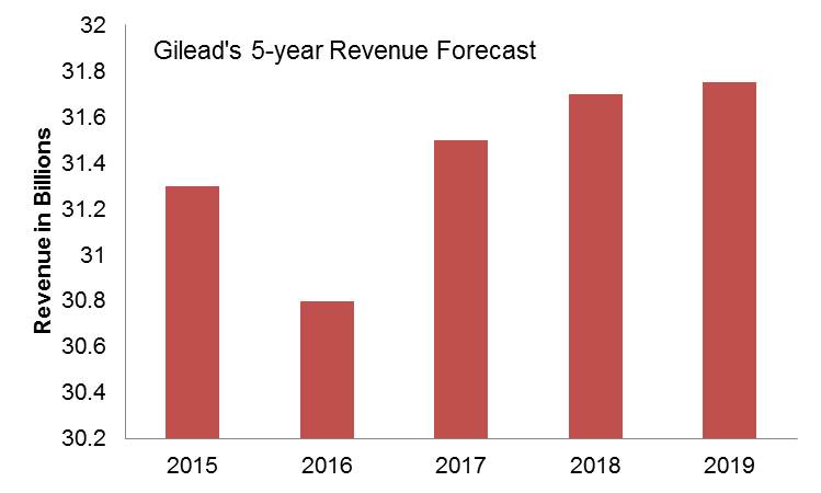 Wall Street thinks these headwinds will cause Gilead's total revenue to slow to a near-stagnant 0.25% CAGR over the next five years:
